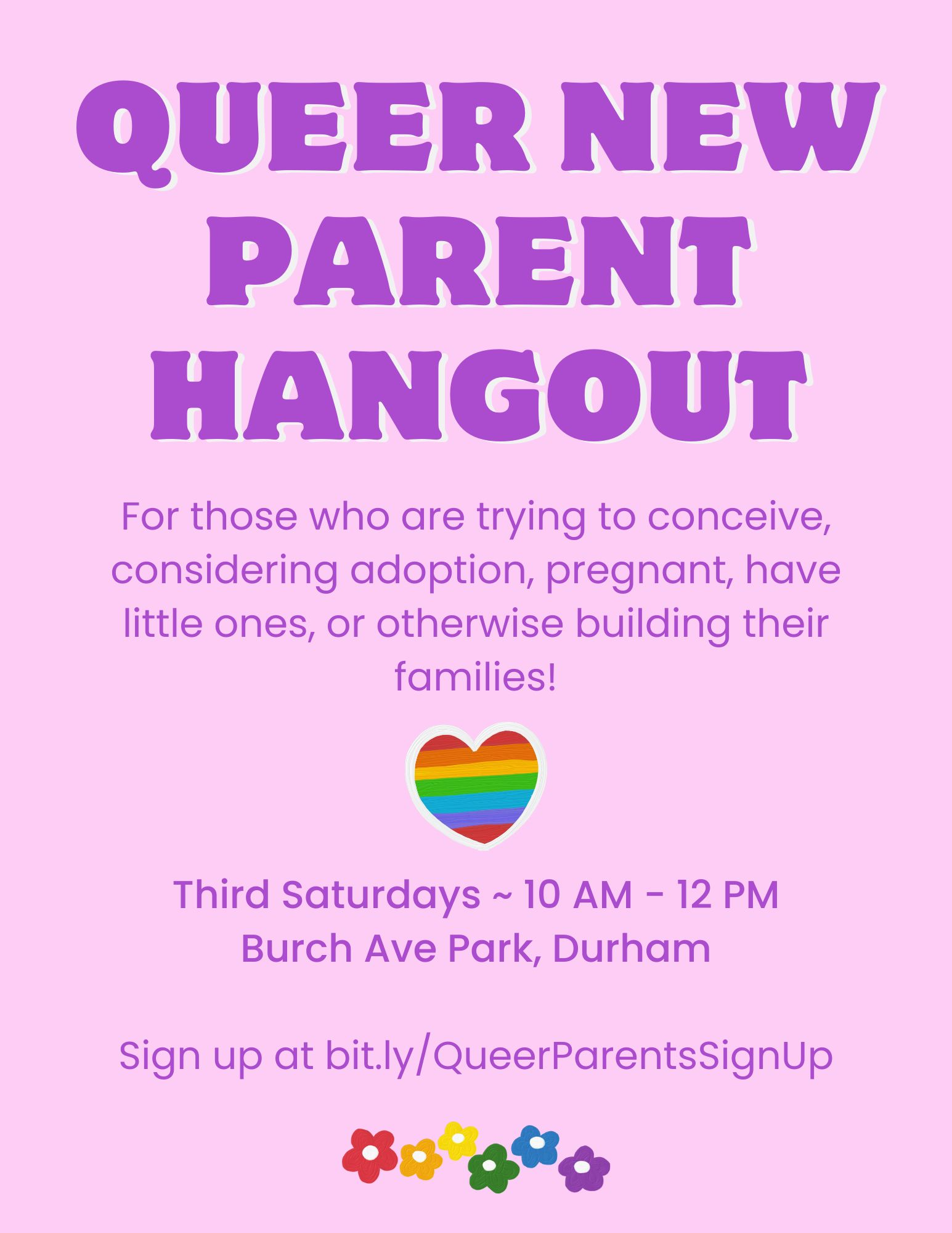 Join TDC Doula, Meredith Wilkinson, for “Queer New Parent Hangout'“ on the Third Saturday in Durham at 10 am - 12 pm.